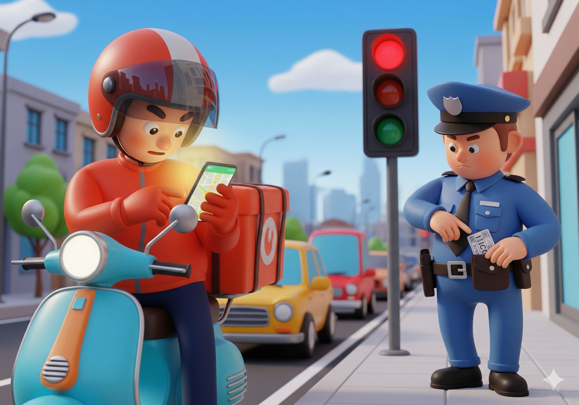 騎車途中要找路,沒裝手機架,只好趁著等紅燈偷偷瞄一下導航。結果…警察就在旁邊看著你,接下來就是1000元罰單,直接飛走!