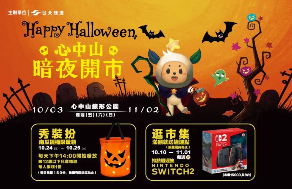 活動亮點:今年「暗夜開市」將整個中山商圈變身萬聖節夜市,每週邀請夜市王與必比登人氣攤商進駐,帶來熱鬧的夜間市集體驗。現場設置4公尺高的「捷米」(台北捷運公司官方吉祥物)氣球,成為今年活動的拍照打卡焦點。10月24、25日兩天開放12歲以下兒童免費領取南瓜桶,可在27家合作店家討糖。